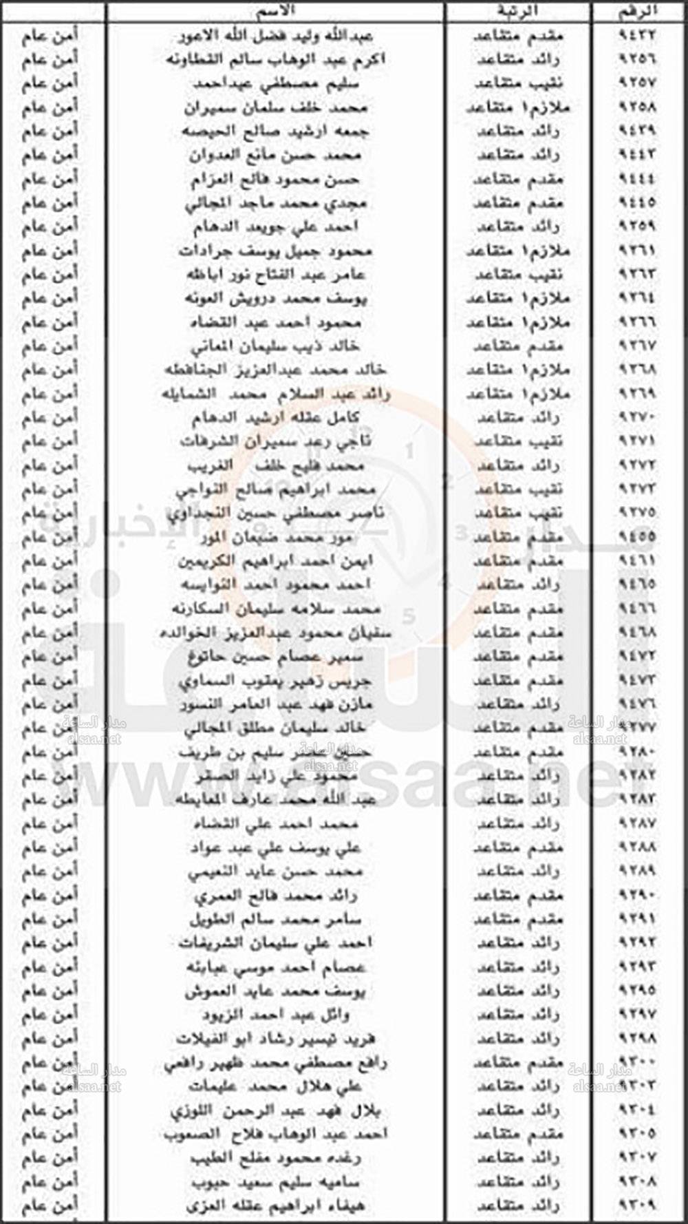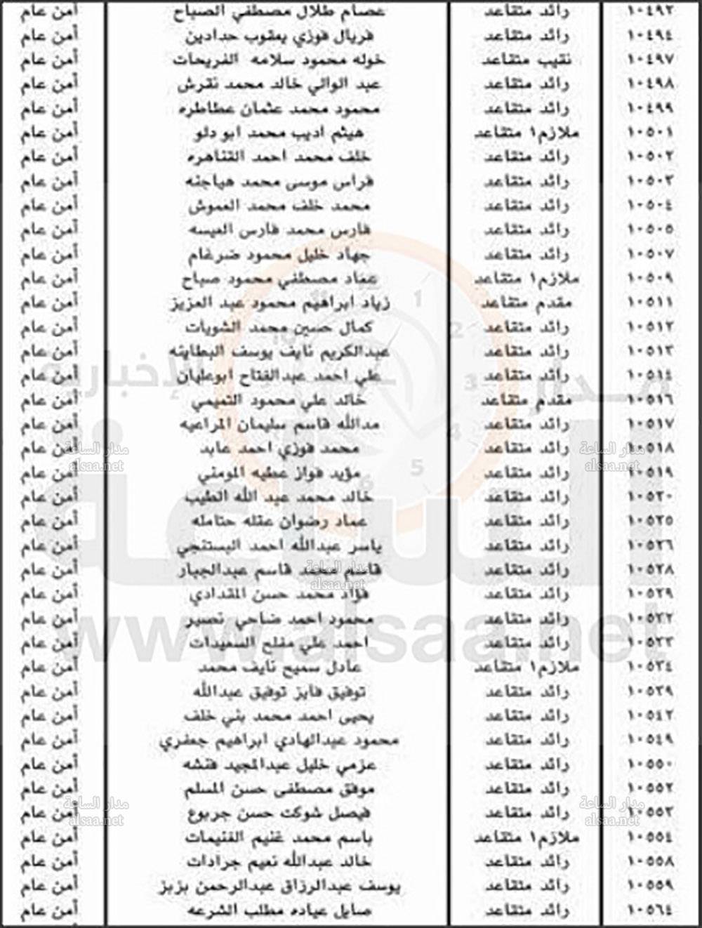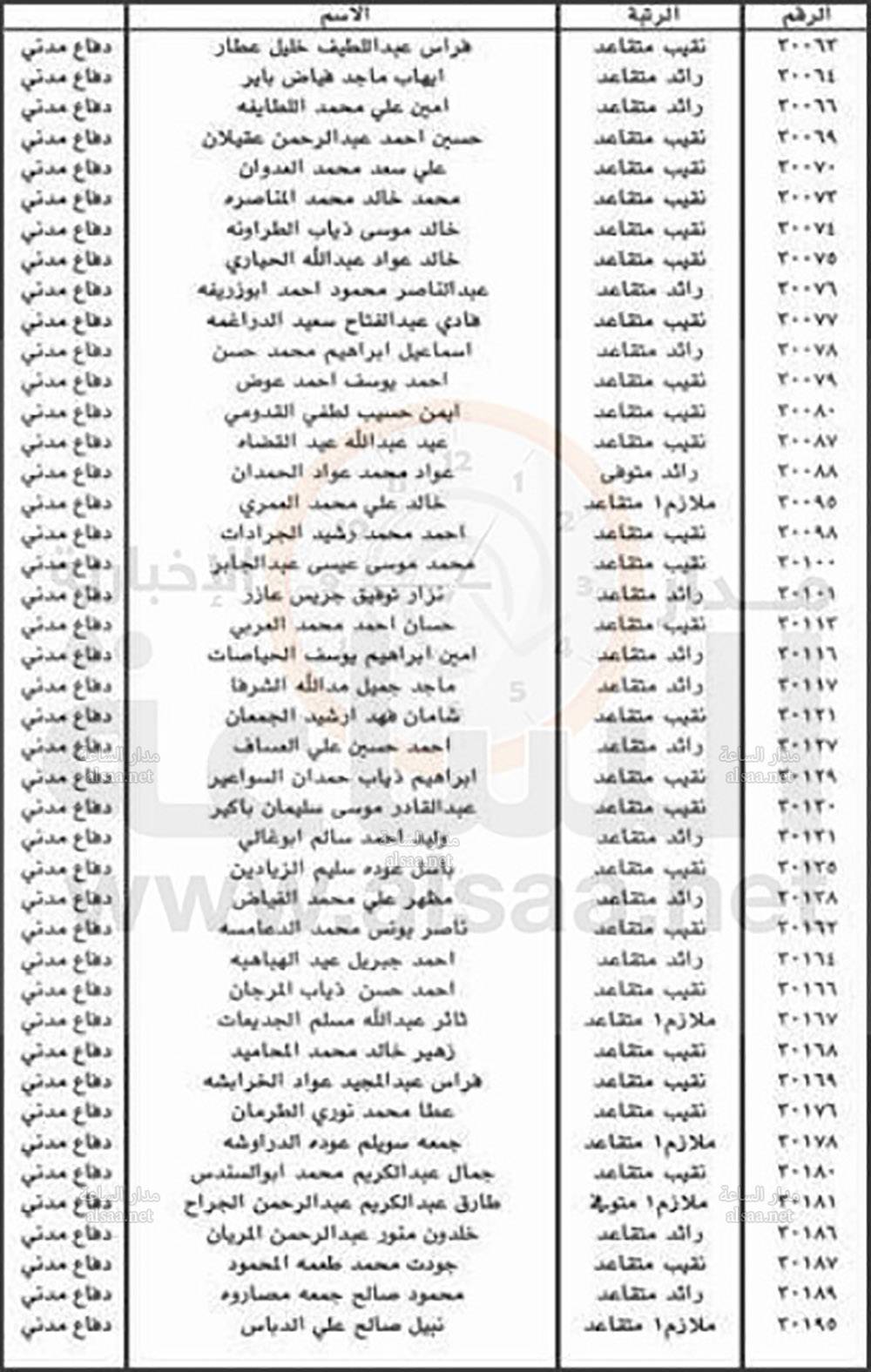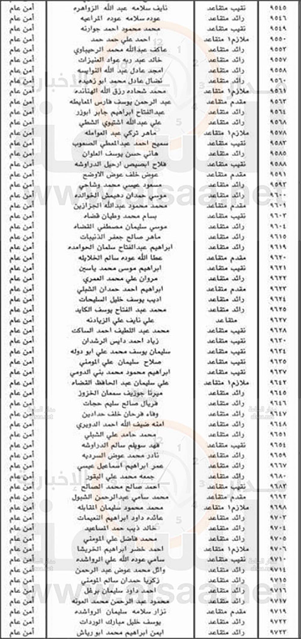 : بالاسماء... الأمن العام يعلن أسماء 600 ضابط متقاعد "أمن عام ودرك دفاع مدني " شملتهم المكرمة الملكية التالية :
