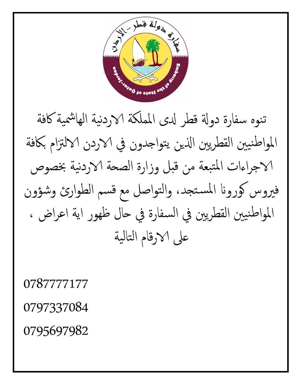 أصدرت  السفارة القطرية مساء السبت تنويهاً لرعاياها في الاردن حول فيروس كورونا المستجد.. جاء فيه تنوه سفارة دولة قطر لدى المملكة الاردنية الهاشمية كافة المواطنيين القطريين الذين يتواجدون في الاردن الالتزام بكافة الاجراءات المتبعة من قبل وزارة الصحة الاردنية بخصوص فيروس كورونا المستجد، والتواصل مع قسم الطوارئ وشؤون المواطنيين القطريين في السفارة في حال ظهور اية اعراض ،