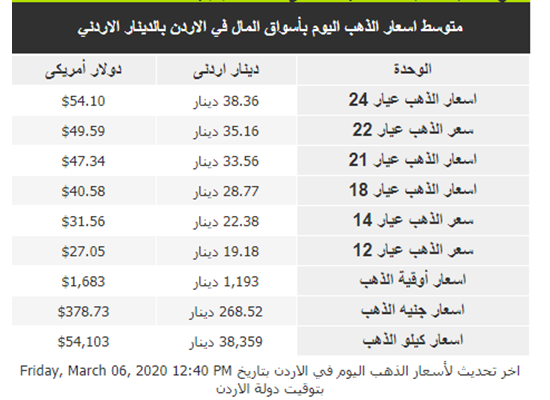 أسعار الذهب في الأردن ليوم الجمعة 6-3-2020 في " الدينار الأردني" وأيضا الدولار الأمريكي.