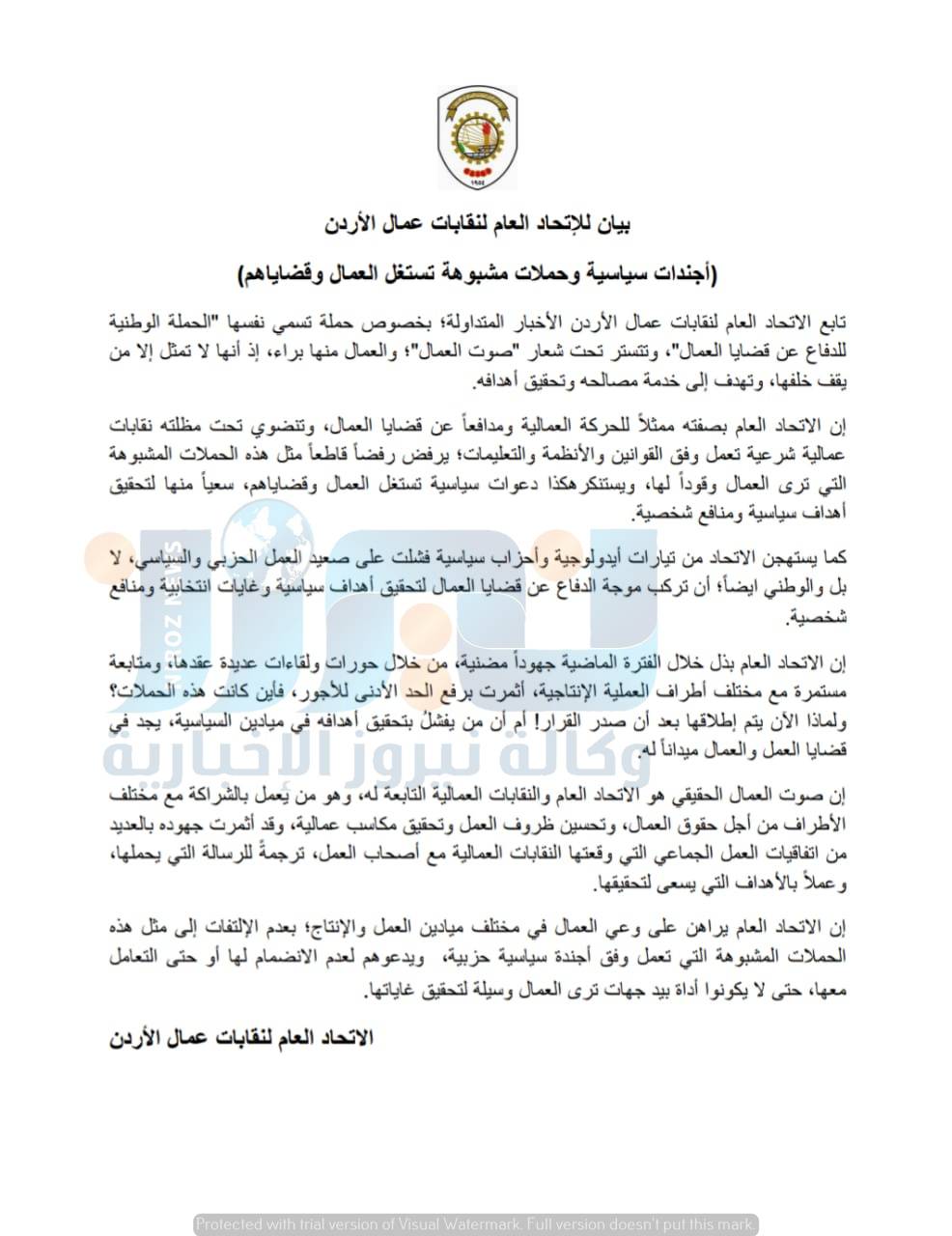 تابع الاتحاد العام لنقابات عمال الأردن الأخبار المتداولة؛ بخصوص حملة تسمي نفسها "الحملة الوطنية للدفاع عن قضايا العمال"، وتتستر تحت شعار "صوت العمال"؛ والعمال منها براء، إذ أنها لا تمثل إلا من يقف خلفها، وتهدف إلى خدمة مصالحه وتحقيق أهدافه.