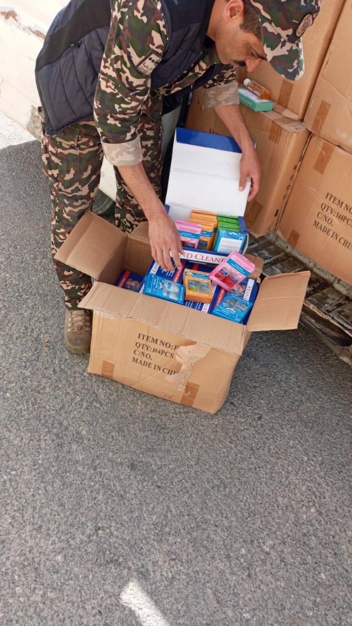 وشملت ايضاً ضبط شاحنتين على الطريق الصحراوي محملات بالبضائع المختلفة ابرزها كميات كبيرة من الهيل والصنوبر والفستق الحلبي إضافة إلى كميات كبيرة من الاجهزة الخلوية واكسسوارتها.