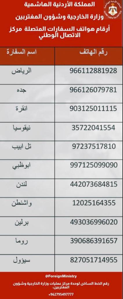 أعلنت وزارة الخارجية وشؤون المغتربين اليوم عن أرقام الخطوط الساخنة/الطوارىء لجميع البعثات الاردنية في الخارج للتواصل على مدار الساعة.