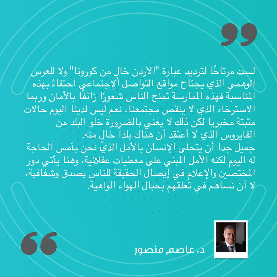 وقال في منشور عبر صفحته الشخصية على الفيس بوك انه ليس مرتاحا لترديد عبارة الأردن خال من كورونا فهذه الممارسة تمنح الناس شعورا زائفا بالأمان وربما الاسترخاء.