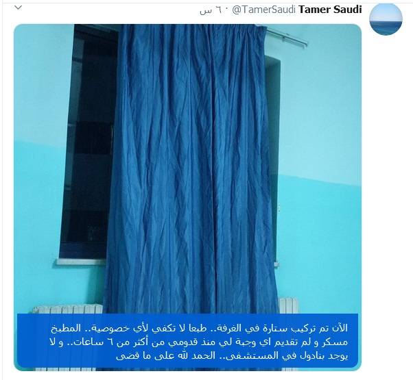 نشر مصاب فيروس "كورونا " تامر السعودي العائد من بريطانيا عبر صفحته الشخصية على موقع التواصل الاجتماعي " تويتر " انه تم تركيب ستارة في الغرفة المخصصة التي تم تحديد إقامته بها للعزل في مستشفى الامير حمزة .