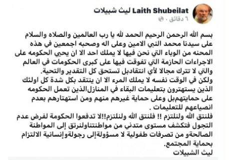 واضاف شبيلات "فلنتق الله ولنلتزم !! فلنتق الله ولنلتزم!! لا تدفعوا الحكومة لفرض عدم التجول فتكشف مستوى متدني من مواطنتنا ولنرتق إلى المواطنة الصالحة و من تصرفات طفولية لا مسؤولة إلى رجولة وإنسانية الالتزام بحماية المجتمع".