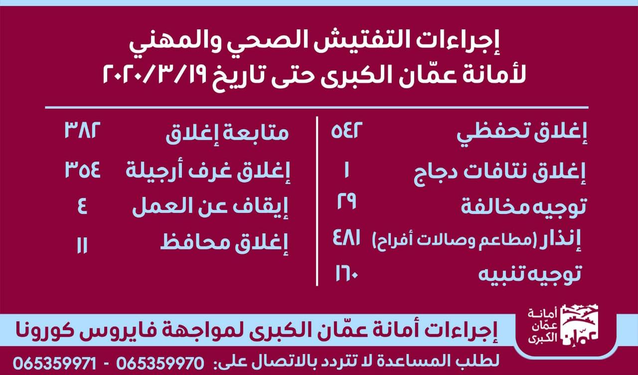 أمانة عمان: اغلاق تحفظي 542 واغلاق نتافة دجاج و29 مخالفة.. وانذار 481 مطعم وصالة افراح وتنبيه 160 منشأة ومتابعة اغلاق 382 منشأة واغلاق 354 غرفة أرجيلة وايقاف 4 منشآت عن العمل والمحافظ يغلق 11 منشأة