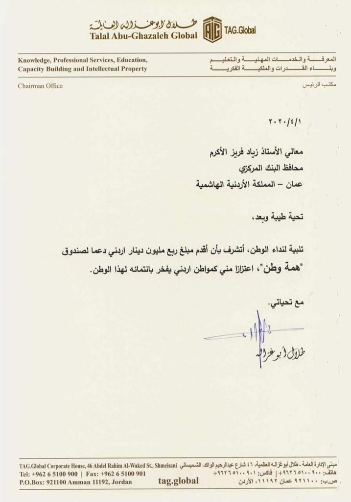 : الدكتور طلال أبوغزاله يتبرع بمبلغ ربع مليون دينار أردني دعما لصندوق "همة وطن".