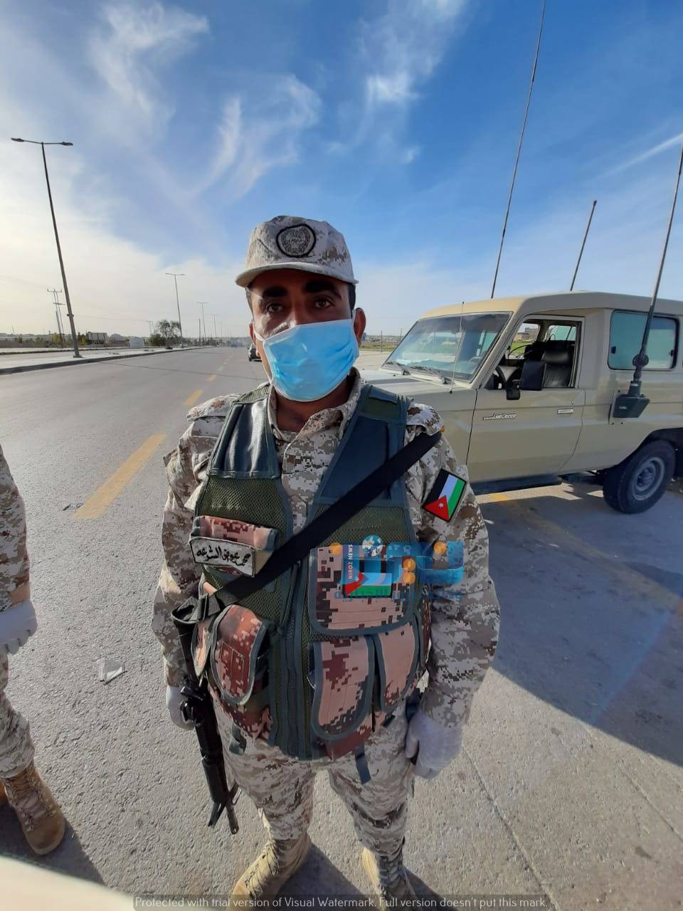 تحية عز واكرام اقدمها لجميع منتسبي قواتنا المسلحة الاردنية وجميع الاجهزة الامنية على ما يبذلوه من جهد في حماية امن وسلامة وطننا الحبيب، والحفاظ على صحة المواطنين من خلال الحفاظ على تطبيق اوامر الدفاع التي اقرها دولة رئيس الوزراء ووزير الدفاع الدكتور عمر الرزاز، والتي تم اعلانها لوقف انتشار فيروس كورونا في اردننا الحبيب، وغدت مضرب مثل على مستوى العالم في التعامل مع انشار الجائحة بحرفية علية ليس لها مثيل.