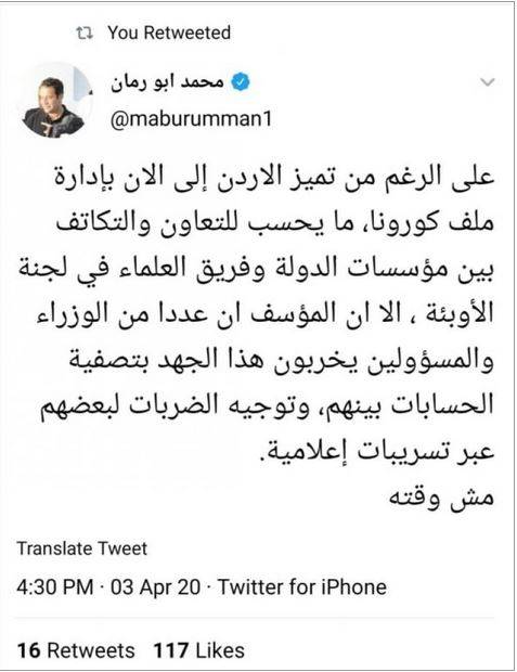 حيث كتب ابو رمان قائلا : " على الرغم من تميز الاردن الى الان بإدارة ملف كورونا ، ما يحسب للتعاون والتكاتف بين مؤسسات الدولة وفريق العلماء في لجنة الاوبئة ، الا ان المؤسف ان عددا من الوزراء والمسؤولين يخربون هذا الجهد بتصفية الحسابات بينهم ، وتوجيه الضربات لبعضهم عبر تسريبات اعلامية . مش وقته "