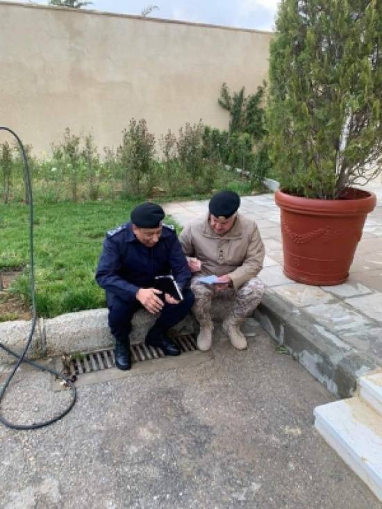 رئيس هيئة الأركان المشتركة اللواء الركن يوسف الحنيطي ومدير الأمن العام اللواء الركن حسين الحواتمة يجلسان على الرصيف ويتناقشان بأمر ما .. الأقرب للظن انه الكورونا التي تمكن هذان البطلان من حصارها في آخر معاقلها ان شاء الله مع تلك الثلة من الجنود الظاهرين والمخفيين .