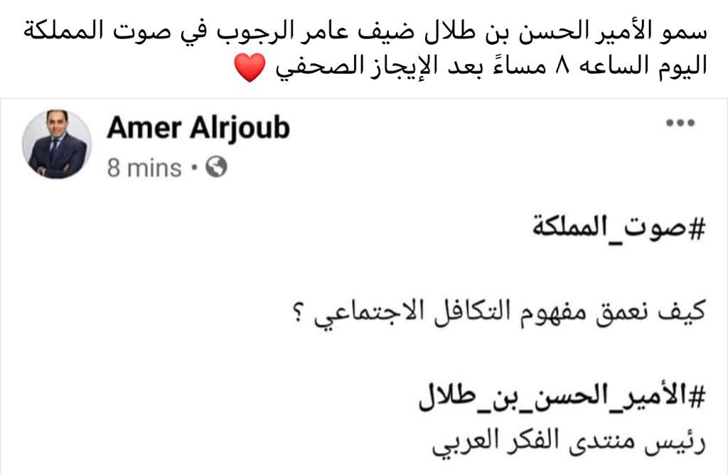 سمو الأمير الحسن بن طلال ضيف على قناة المملكة برنامج صوت المملكة مع الاعلامي عامر الرجوب على الساعة 8مساء اليوم الاثنين.