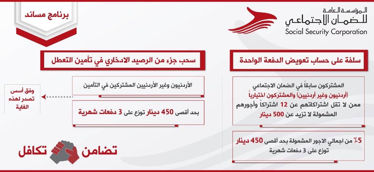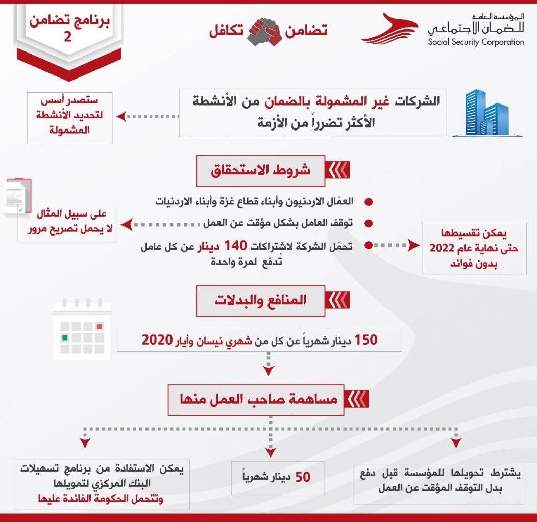 يشمل المنشآت المسجلة بالضمان والمتضررة من الظروف الحالية ويستطيع الموظفون فيها الحصول على 50 بالمئة من رواتبهم كبدل تعطل مؤقت بحد أدنى 165 ديناراً وبحد أعلى 500 دينار، بشرط أن يكوم له 12 اشتراكاً بالضمان أو أكثر.