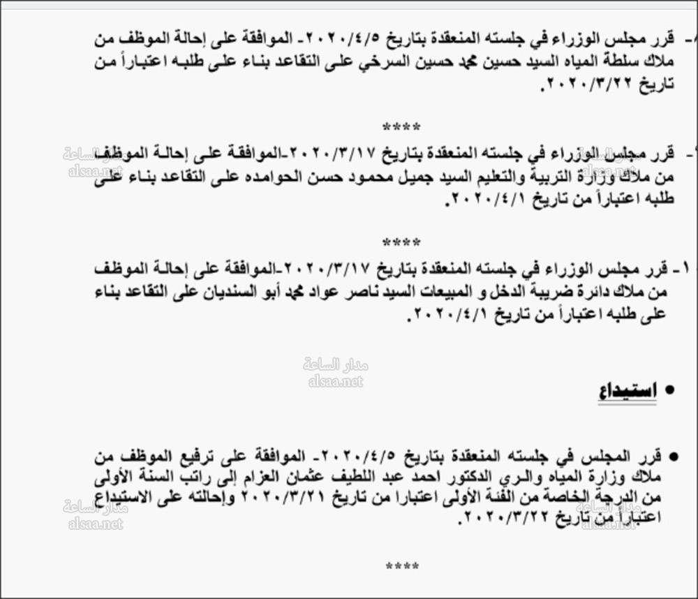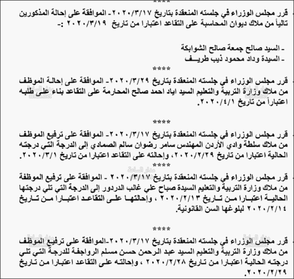 قرر مجلس الوزراء احالة موظفين الى التقاعد، وآخرين الى الاستيداع، وهم: