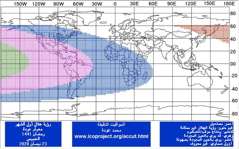 الخارطة أدناه تبين مدى إمكانية رؤية هلال شهر رمضان يوم الخميس 23 إبريل من جميع مناطق العالم، بحيث أن: