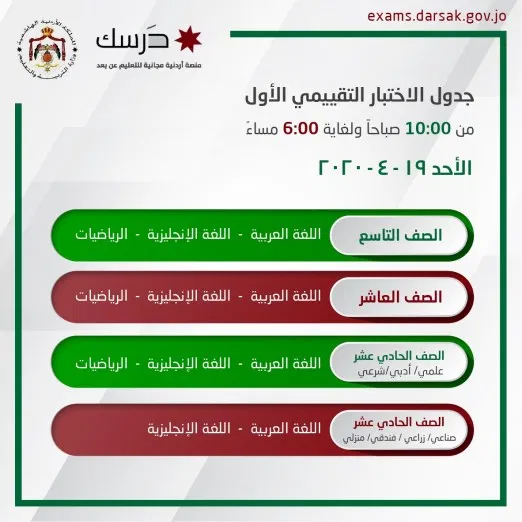 اعلنت وزارة التربية والتعليم اليوم عن جدول الاختبار التقييمي الذي سيعقد يوم الأحد الموافق ١٩ /نيسان /٢٠٢٠ على منصة درسك سيكون وفق الآتي: