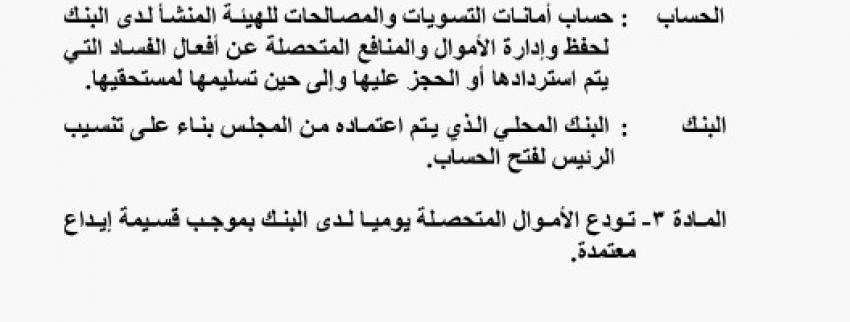 وينشأ الحساب لدى البنك لحفظ وإدارة الأموال والمنافع المتحصلة عن أفعال الفساد التي يتم استردادها أو الحجز عليها وإلى حين تسليمها لمستحقيها.