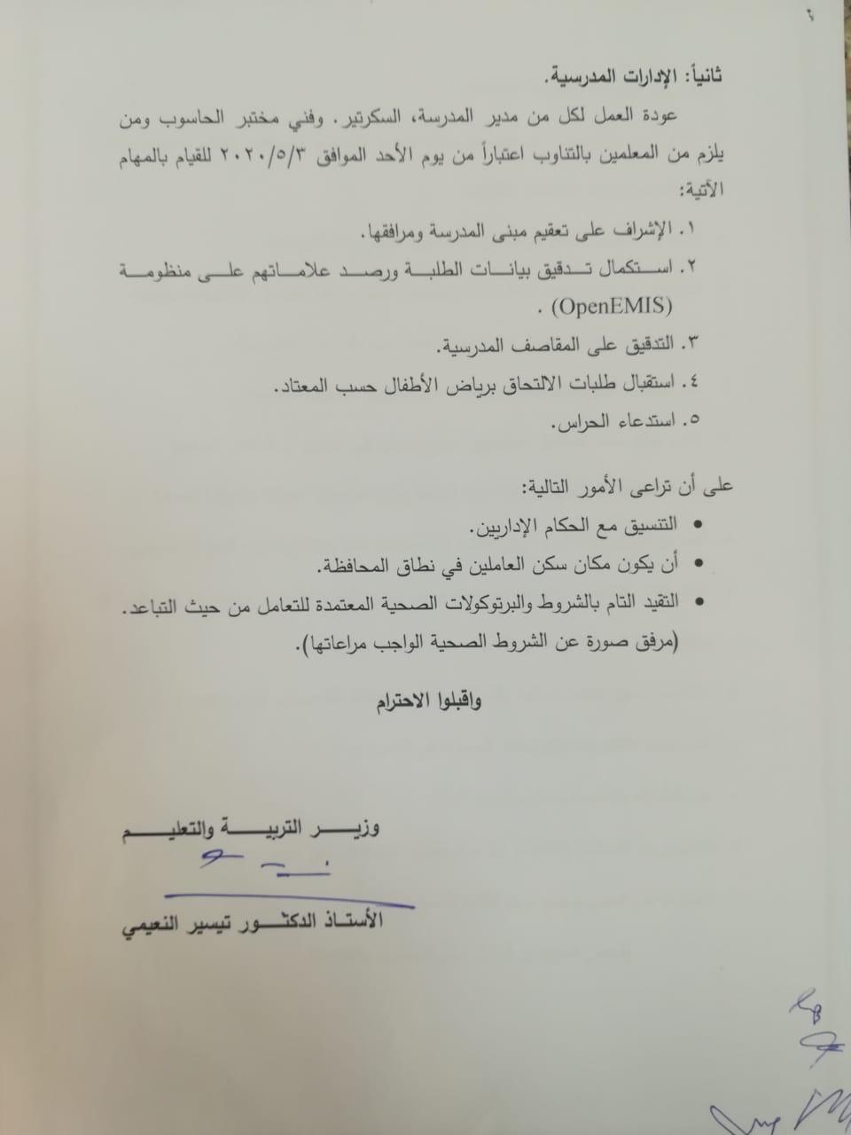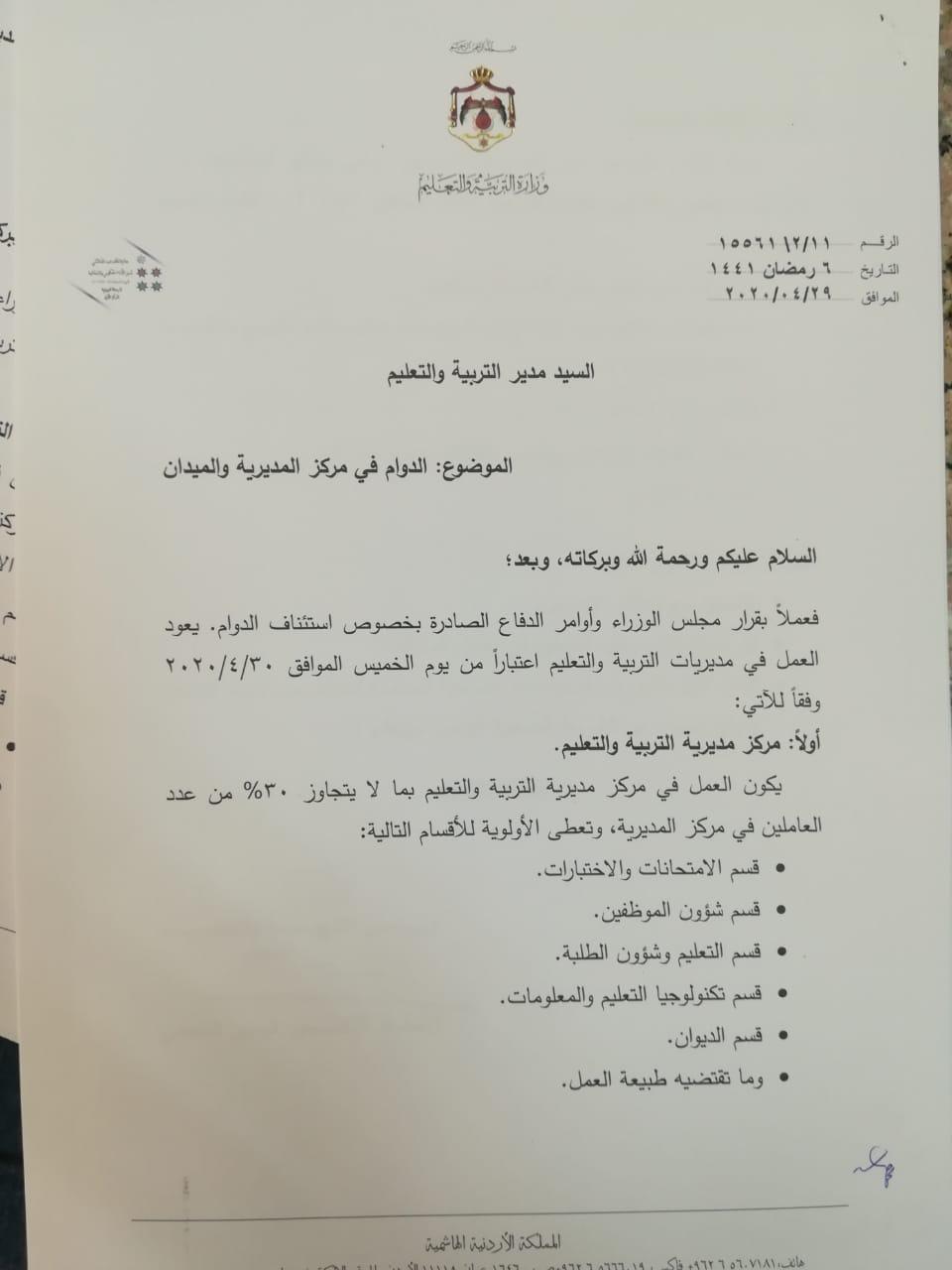 اصدر وزير التربية والتعليم قراراً ببدأ دوام الهيئات الادارية للمدارس والتي تتكون من مدير المدرسة والسكرتير وفني مختبر الحاسوب بالاضافة الى ما يلزم من معلمين وفيما يلي نص كتاب وزير التربية