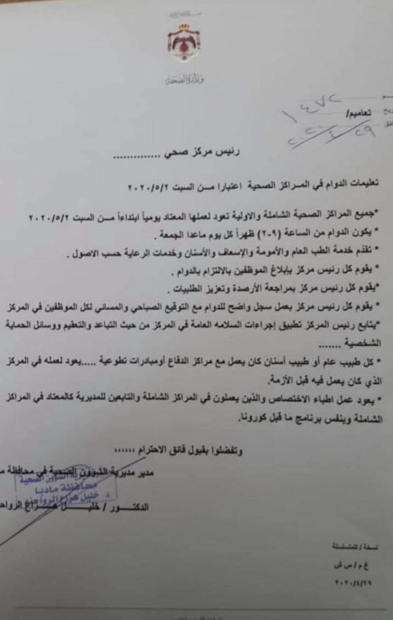 الصحة : عودة العمل في المراكز الصحية الشاملة والأولية اعتباراً من السبت القادم.. وثيقه