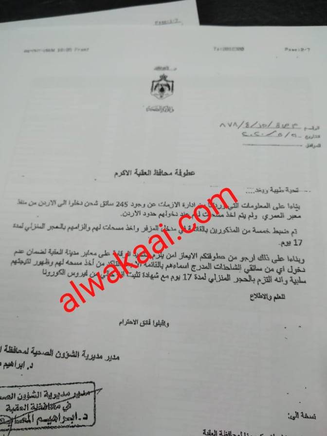 وبحسب وثيقة فإن السائقين دخلوا الحدود من معبر العمري، دون إجراء الفحوصات الطبية اللازمة لهم للتأكد من خلوهم من فايروس كورونا.