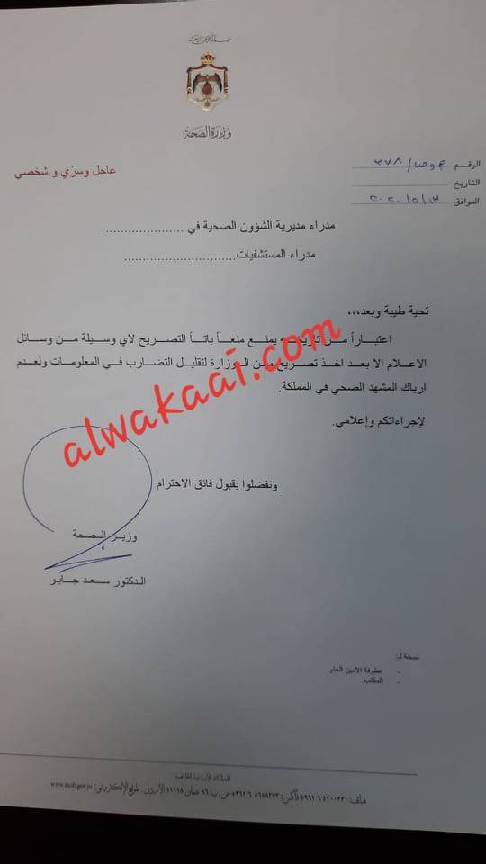جابر يمنع مدراء الصحة والمستشفيات من التصريح لأي وسيلة إعلام... وثيقة