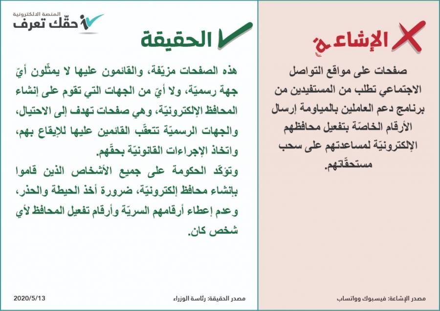 حذرت رئاسة الوزراء من صفحات مزيّفة تطلب أرقام تفعيل المحافظ الإلكترونيّة للمستفيدين من برنامج دعم العاملين بالمياومة بهدف الاحتيال، ويتمّ تعقّب القائمين عليها.
