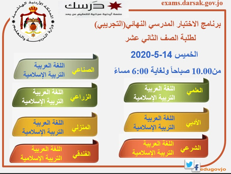 اعلنت وزارة التربية والتعليم ان الاختبار التجريبي لطلبة الصف الثاني عشر (التوجيهي) سيعقد يوم الخميس الموافق ١٤ / ٥/ ٢٠٢٠ على منصة درسك وسيكون وفق الآتي: