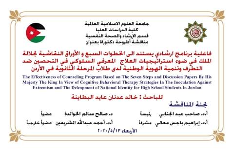 وجاءت رسالة الدكتوراة بعنوان " فاعلية برنامج إرشادي يستند إلى الخطوات السبع و الأوراق النقاشية لجلالة الملك في ضوء استراتيجيات العلاج المعرفي السلوكي في التحصين ضد التطرف وتنمية الهوية الوطنية لدى طلاب المرحلة الثانوية في الأردن" للطالب خالد عدنان عايد البطاينة من قسم الإرشاد والصحة النفسية في جامعة العلوم الإسلامية العالمية.