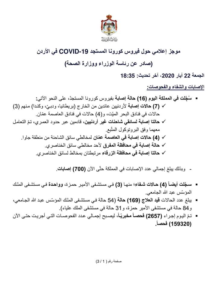 موجز إعلامي حول فيروس كورونا المستجد COVID-19 في الأردن(صادر عن رئاسة الوزراء ووزارة الصحة)