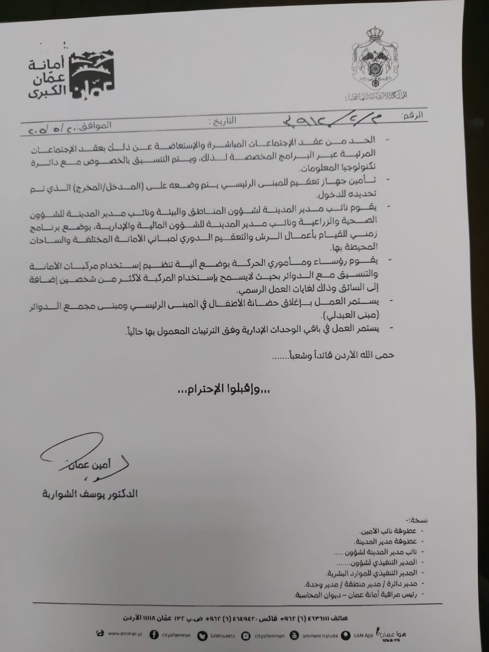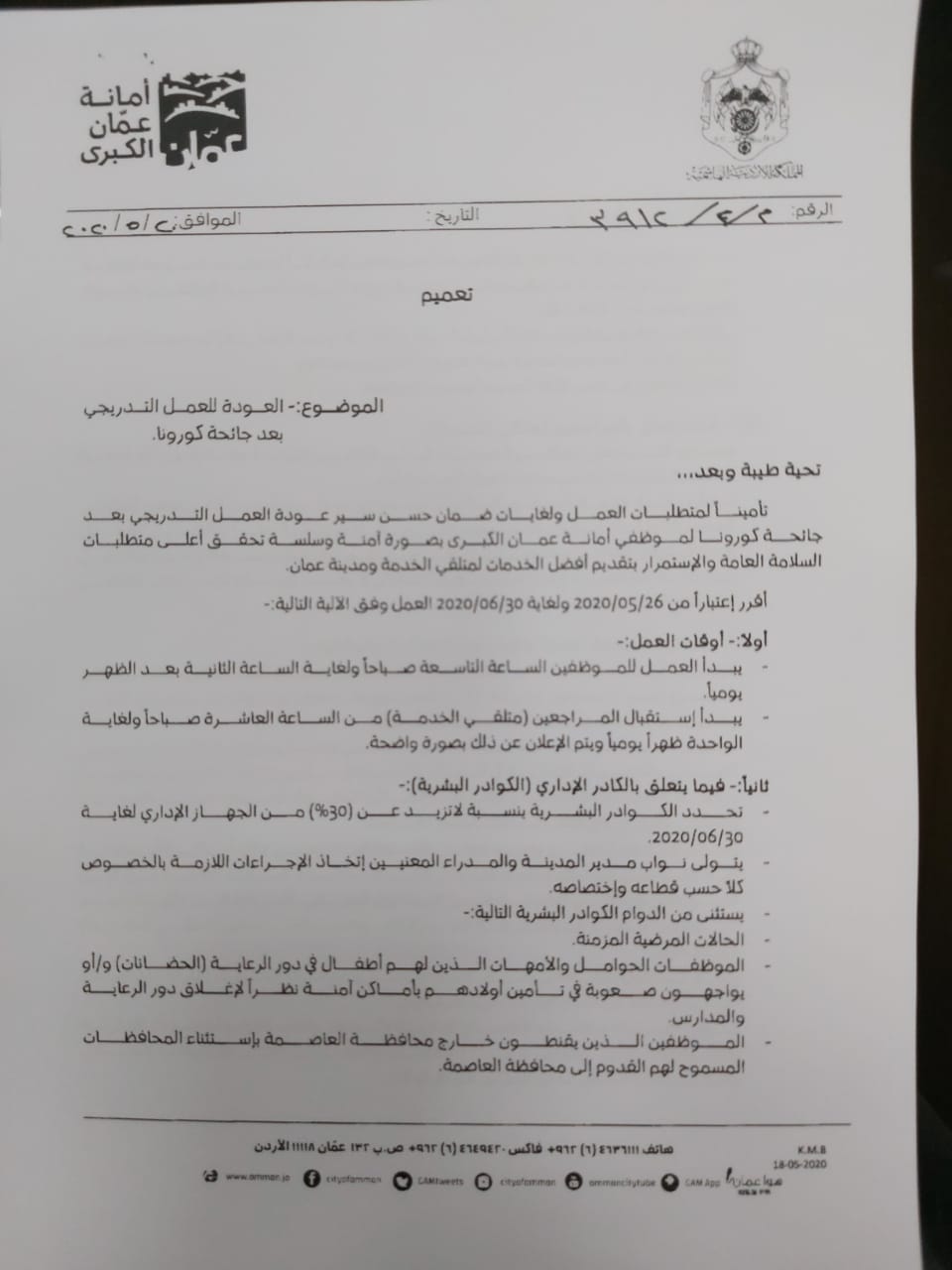 عاد عمال الوطن في أمانة عمان الكبرى إلى العمل اليوم بالطاقة الكاملة في مناطقها الـ22 مع الالتزام باشتراطات الصحة العامة.