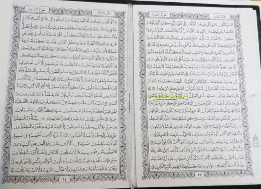 واضافت الوزارة في تعميمها، انه تبين وجود نقص كلمة (قال) من قوله تعالى: (قال بلى ولكن) من سورة البقرة الآية 260 صحفة 23.