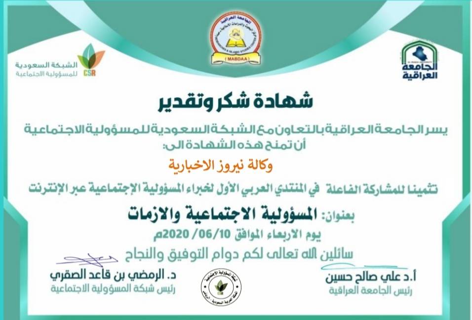 قدمت الجامعة العربية العراقية  بالتعاون مع الشبكة السعودية للمسؤولية الإجتماعية شهادة شكر وتقدير الى وكالة نيروز الإخبارية.