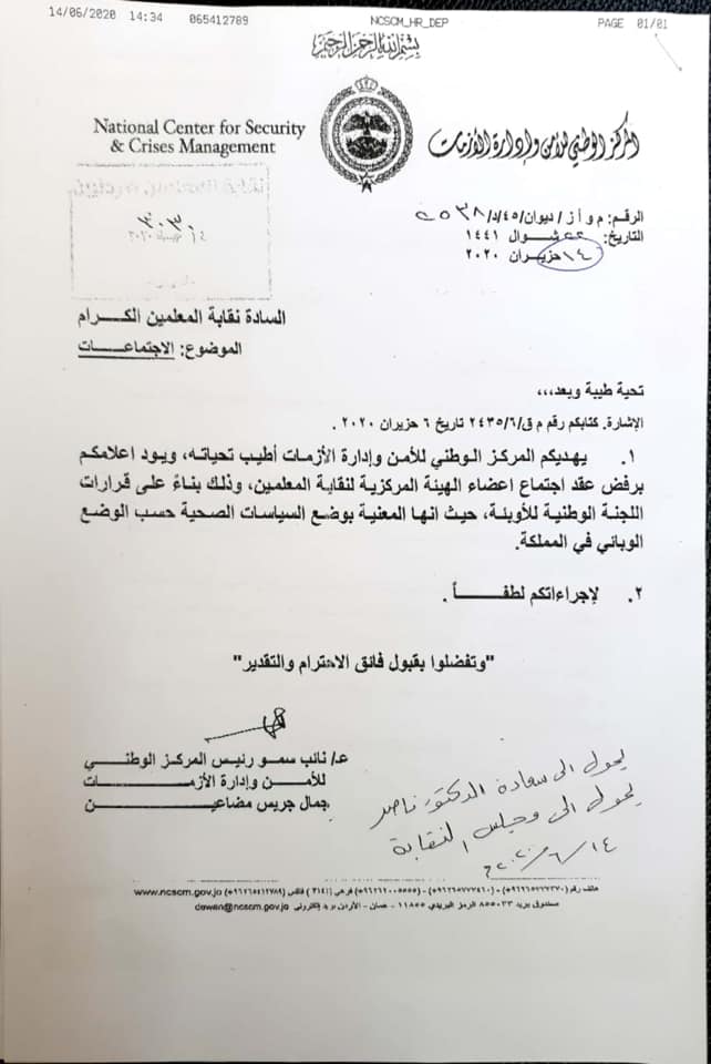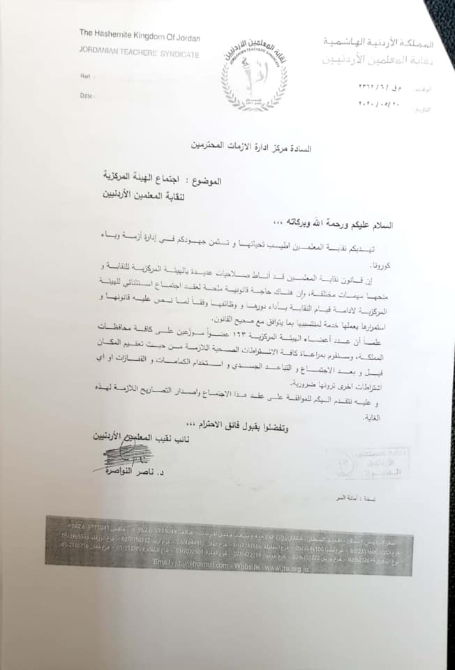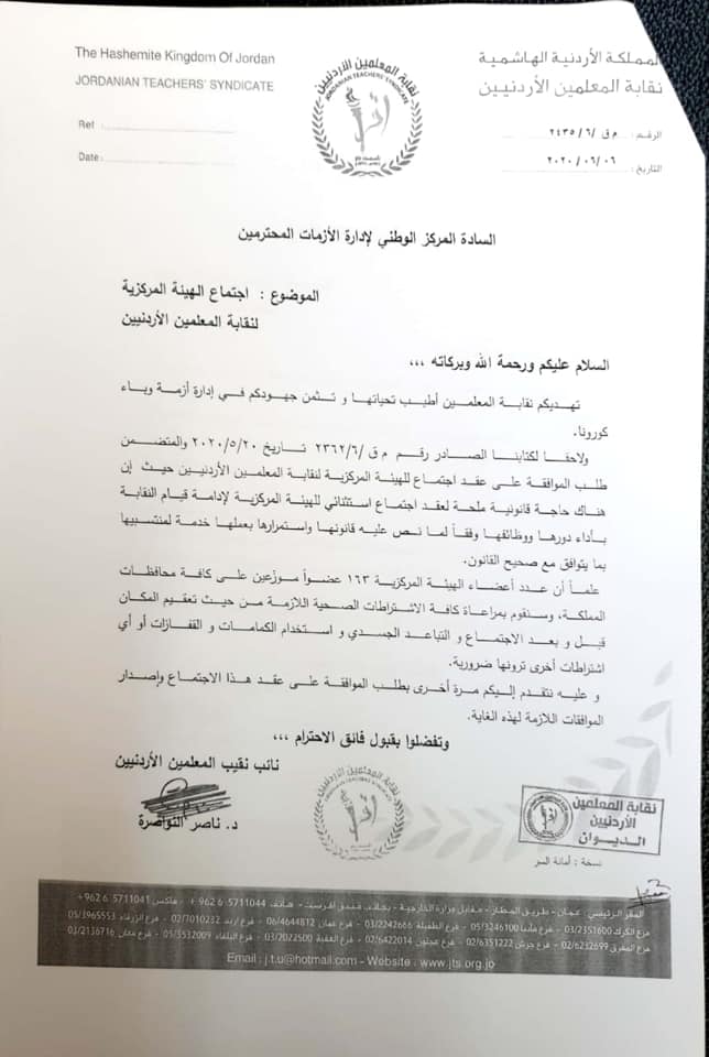 رسالة من نقابة المعلمين إلى مركز ادارة الأزمات