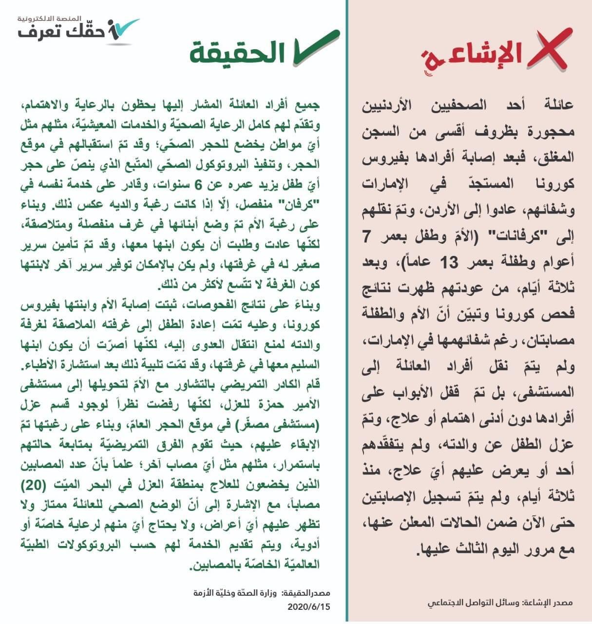 نفت الحكومة عير منصة "حقك تعرف" مساء الاثنين، ما يتم تناقله عبر مواقع التواصل الاجتماعي حول إخضاع عائلة أحد الصحفيين للحجر الصحّي في ظروف قاسية، مؤكدة انها شائعة "غير صحيحة".