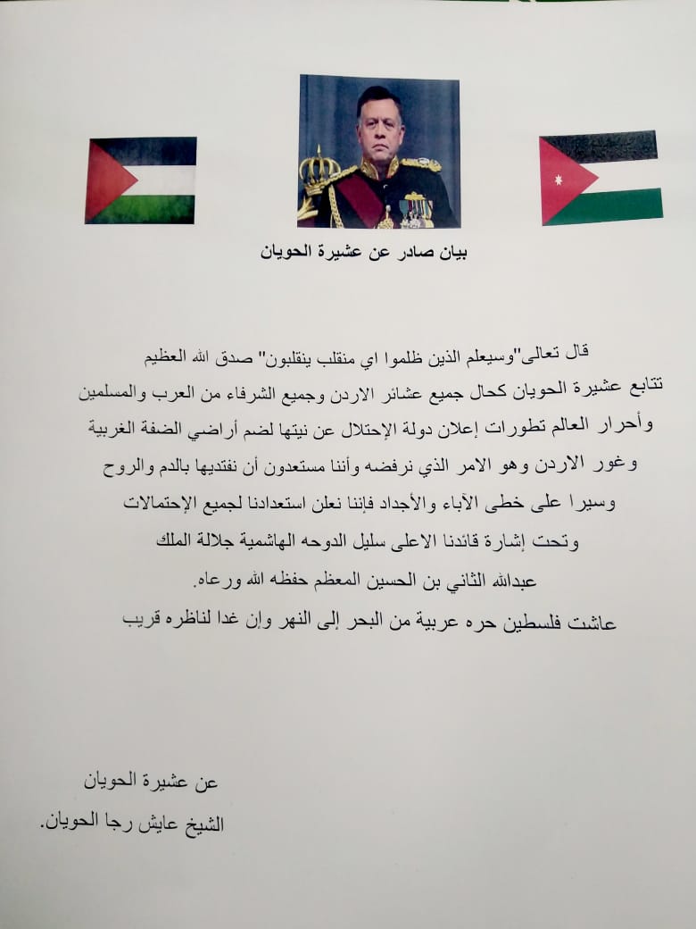 وصل موقع نيروز الاخبارية بيان صادر عن عشيرة الحويان حول إعلان دولة الاحتلال...