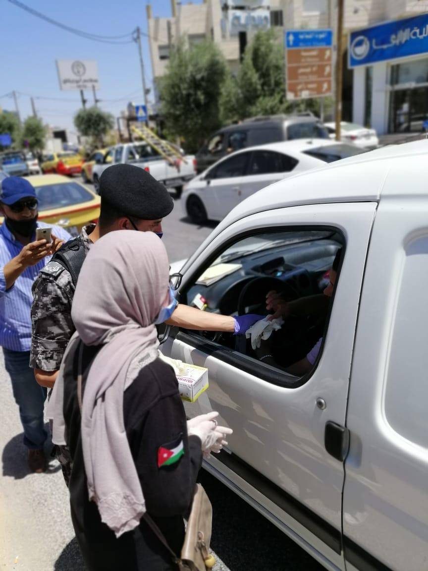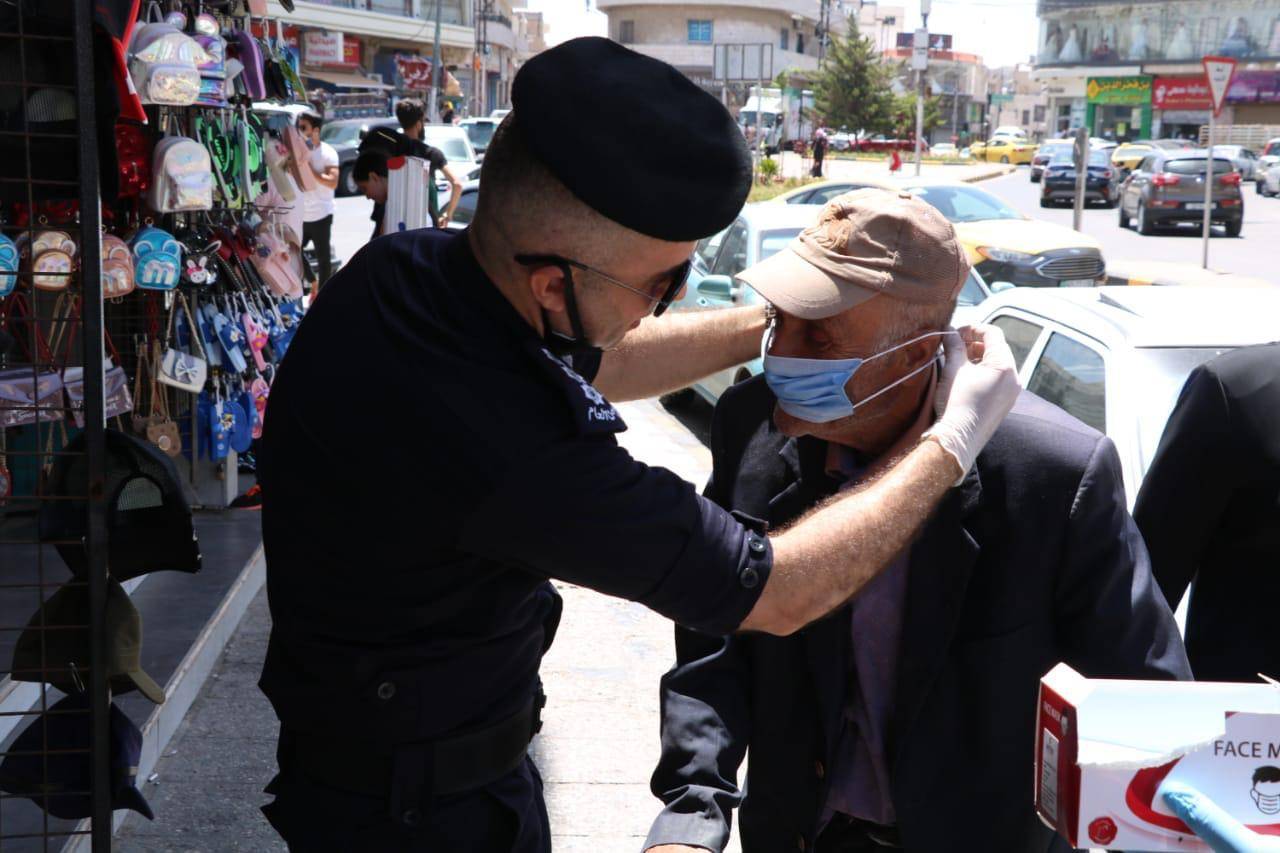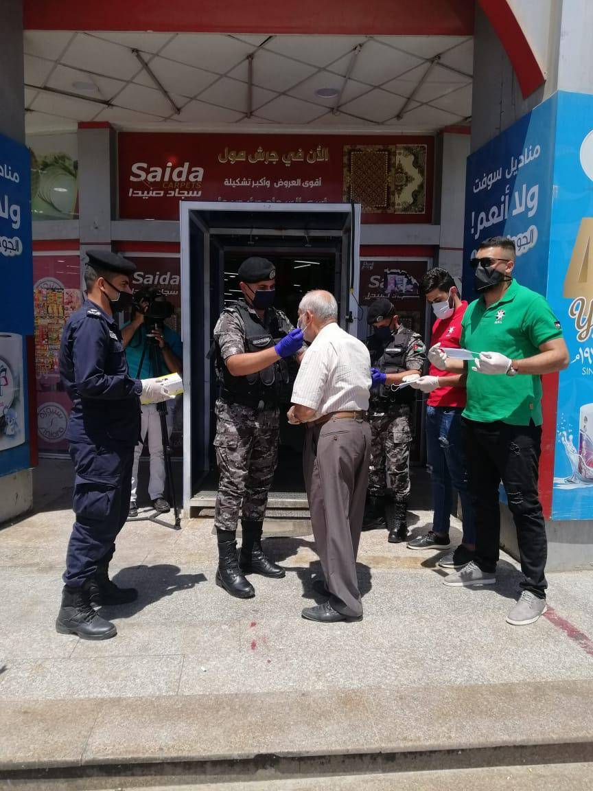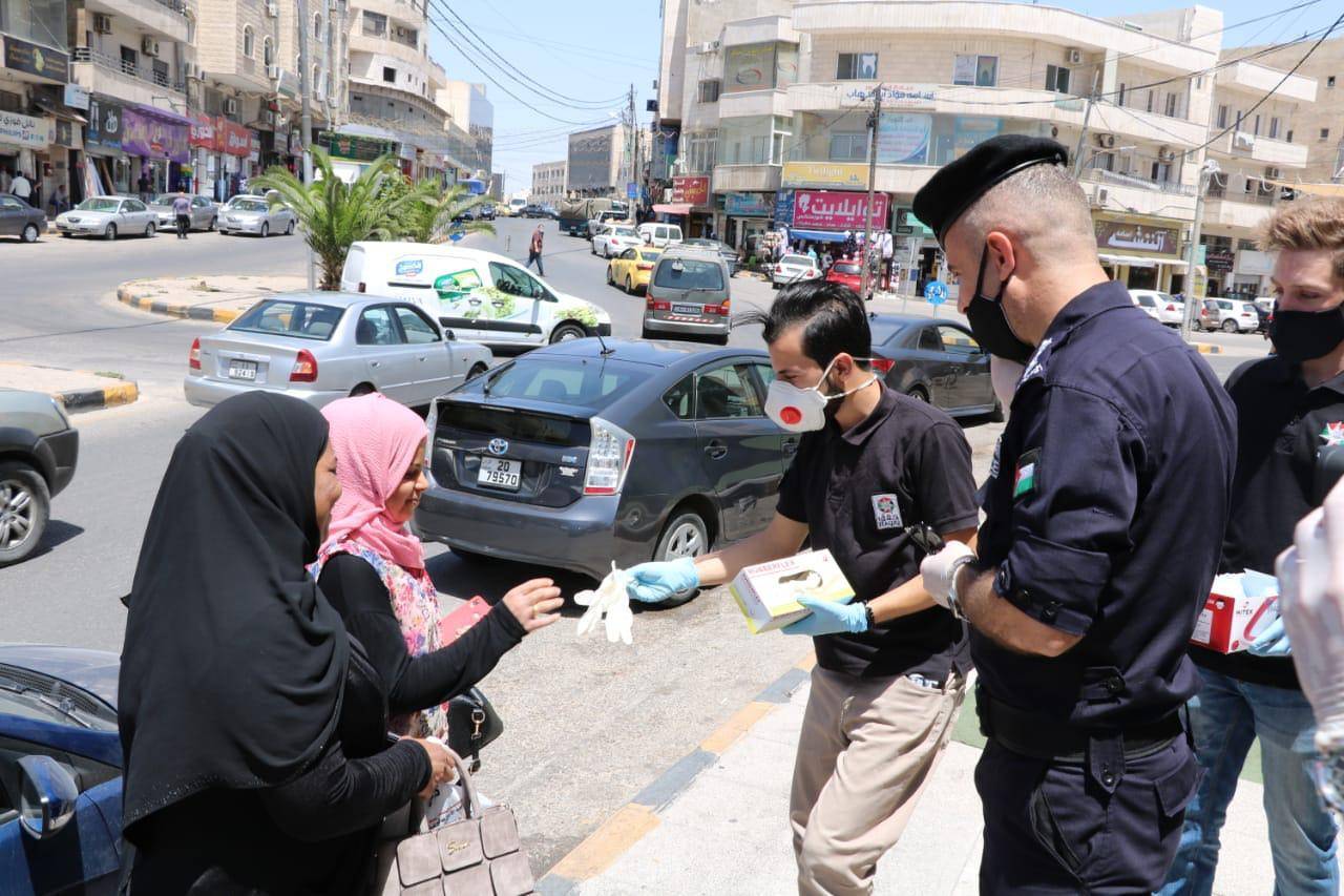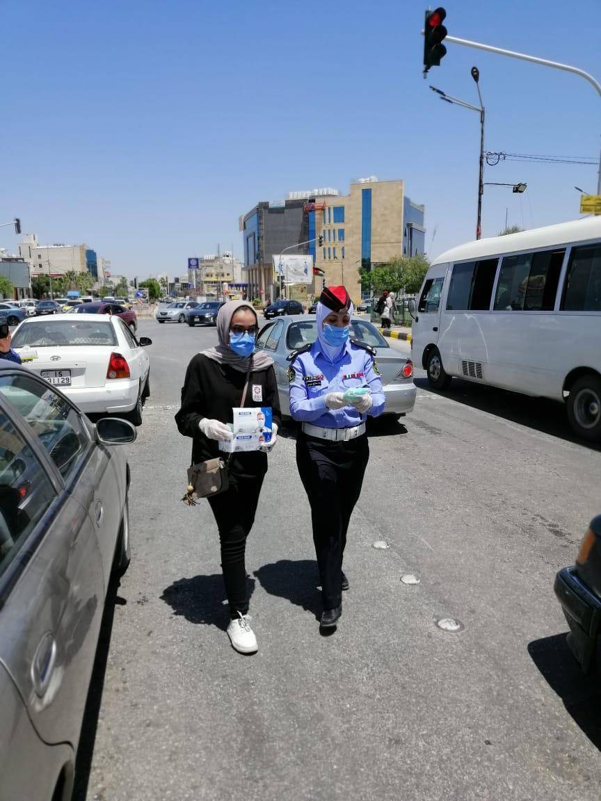 وتوزعت فرق من ضباط وأفراد الشرطة المجتمعية يرافقهم مجموعة من فرسان وفارسات مبادرة حقق إحدى مبادرات مؤسسة ولي العهد ، في الأماكن العامة في مختلف محافظات المملكة حيث قاموا بتوزيع أدوات السلامة العامة من كمامات وكفوف على المواطنين وتحفيزهم على ارتدائها وتوعيتهم بضرورة الاستمرار بالحفاظ على النصائح والإجراءات الصحية .