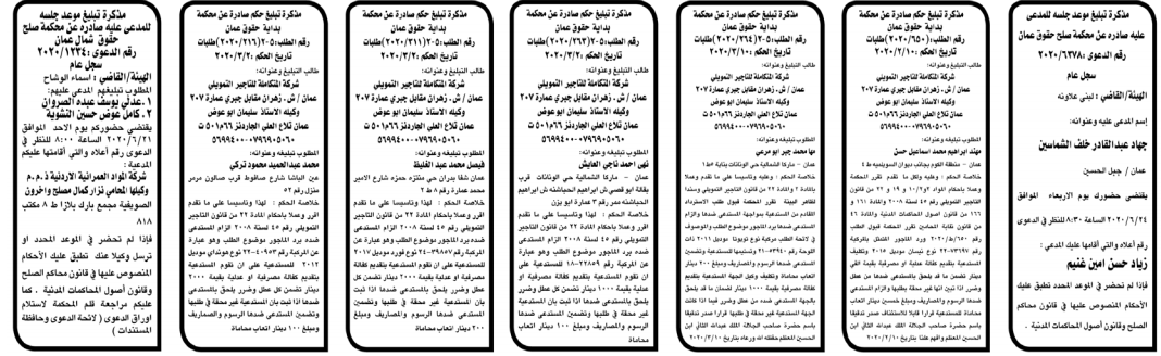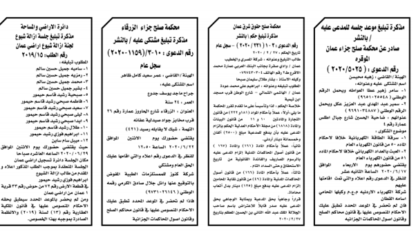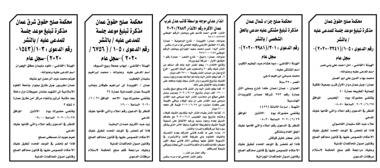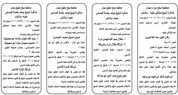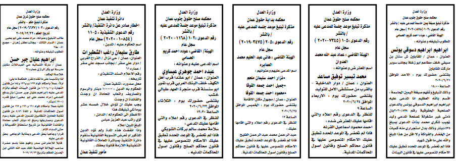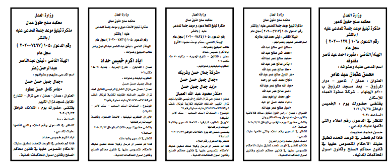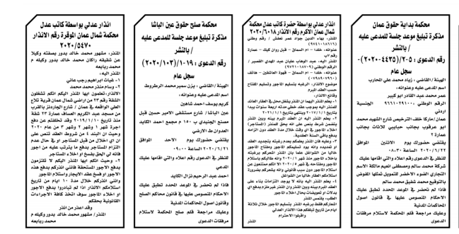 نيروز الإخبارية : أعلنت وزارة العدل اليوم الخميس عن مذكرات تبليغ مواعيد جلسات المحاكمة للمدعى عليهم بقضايا مختلفة عن طريق المحاكم.