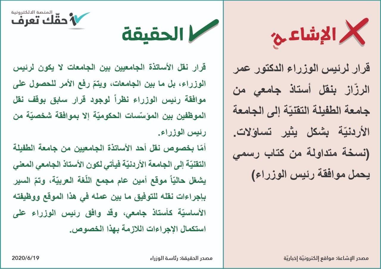 وأضافت رئاسة الوزراء: "أما بخصوص نقل أحد الأساتذة الجامعيين من جامعة الطفيلة التقنية إلى الجامعة الأردنية؛ فيأتي لكون الأستاذ الجامعي المعني يشغل حالياً موقع أمين عام مجمع اللغة العربية، وتم السير بإجراءات نقله للتوفيق ما بين عمله في هذا الموقع ووظيفته الأساسية كأستاذ جامعي، وقد وافق رئيس الوزراء على استكمال الإجراءات اللازمة بهذا الخصوص"