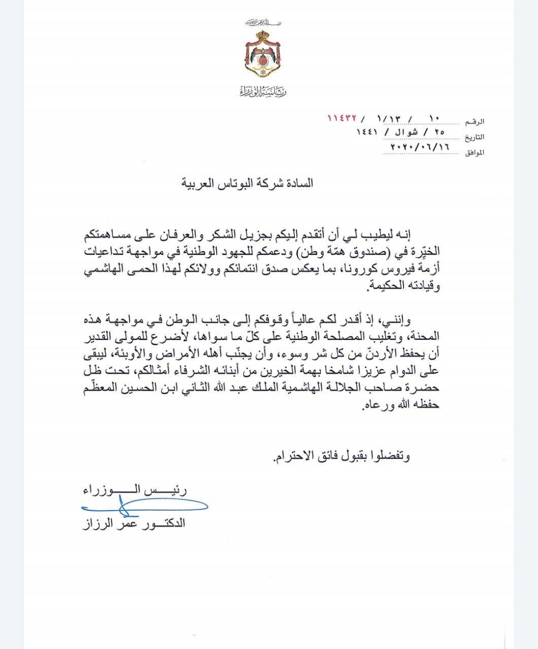 ثمن رئيس الوزراء الدكتور عمر الرزاز، مساهمة شركة البوتاس العربية الخيرة في صندوق همة وطن، ودعمها للجهود الوطنية في مواجهة تداعيات أزمة فيروس كورونا،بما يعكس صدق انتماء وولاء القائمين عليها والعاملين فيها للوطن وقيادته الحكيمة.