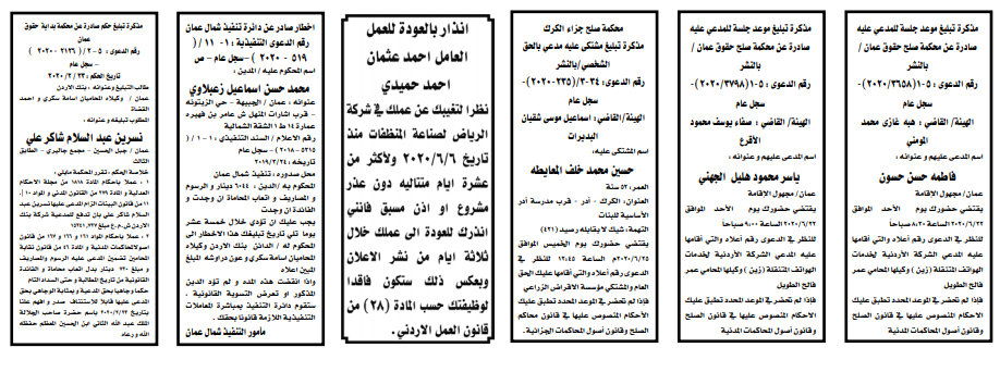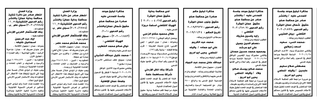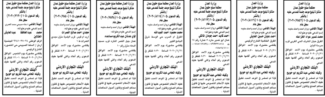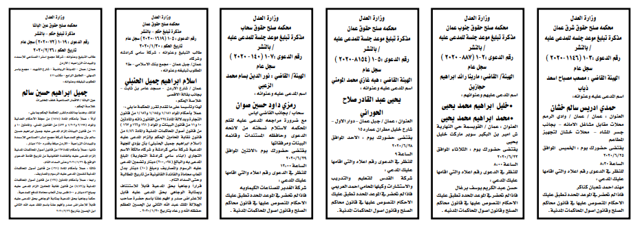 أعلنت وزارة العدل اليوم الاحد عن مذكرات تبليغ مواعيد جلسات المحاكمة للمدعى عليهم بقضايا مختلفة عن طريق المحاكم.