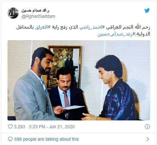وتذكرت ابنة صدام حسين الراحل بهذه الكلمات عبر حسابها الرسمي على موقع "تويتر" والوحيد على مواقع التواصل الاجتماعي: "رحم الله النجم العراقي أحمد راضي الذي رفع راية العراق بالمحافل الدولية".