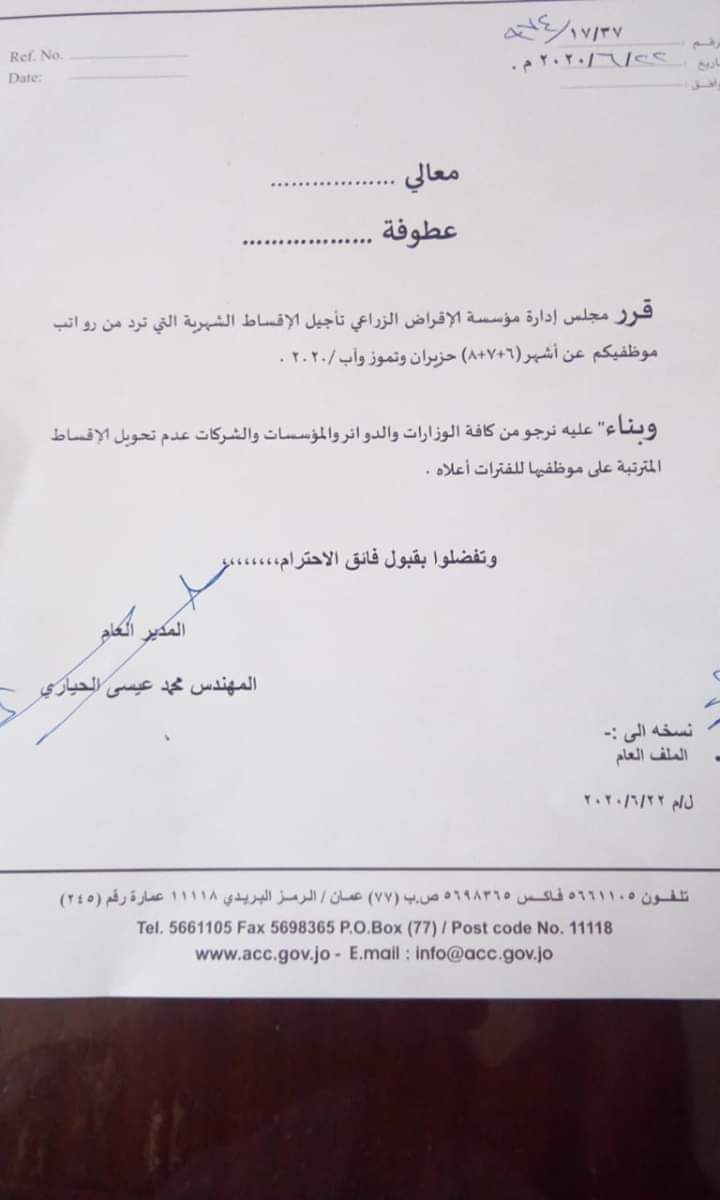 اكد المدير العام لمؤسسة الإقراض الزراعي، المهندس محمد الحياري، ان المؤسسة وجهت تعميماً لكافة الوزارات و المؤسسات الحكومية بعدم اقتطاع الاقساط الشهرية على الموظفين، المقترضين عبر المؤسسة، او كفلاءهم.