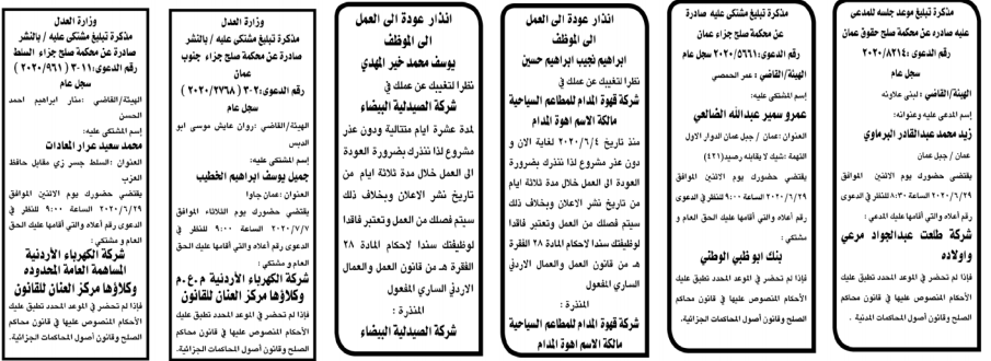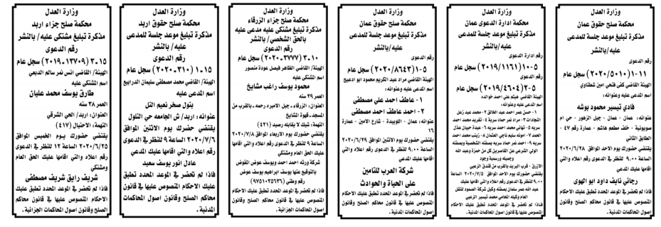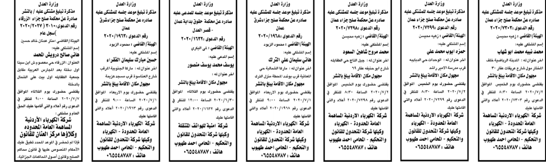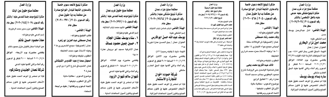 أعلنت وزارة العدل اليوم الخميس عن مذكرات تبليغ مواعيد جلسات المحاكمة للمدعى عليهم بقضايا مختلفة عن طريق المحاكم.