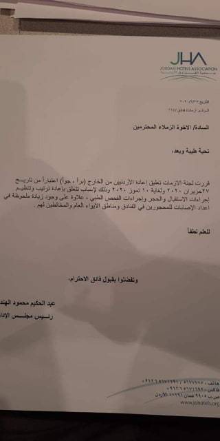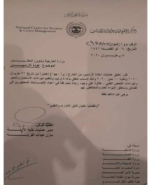 قررت ادارة عمليات خلية الازمة تعليق اعادة الاردنيين من الخارج "برل ،جوا " اعتبارا من تاريخ ٢٧ حزيران ولغاية ١٠ تموز ٢٠٢٠ .