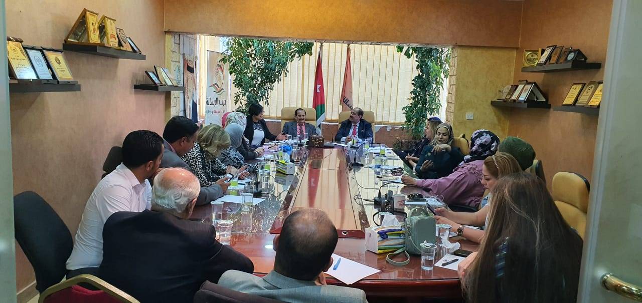 مؤتمر حول جانحة كورونا فى حزب الرساله يتناول آثره وتداعيات وقصه النجاح الاردنيه التى قدمت نموذج يحتذى فى العمل الوقائي والاحترازى والعلاجي والتزام الوطنى فى المقررات المتخذه اضافه الى اثاره المعيشيه والاقتصاديه والتربويه ..