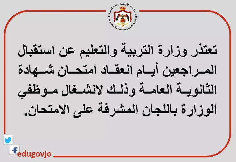 نشرت وزارة التربية والتعليم، اليوم الخميس، في صفحتها بموقع التواصل الاجتماعي "فيسبوك" أنها تعتذر عن استقبال المراجعين أيام انعقاد امتحان الثانوية العامة.