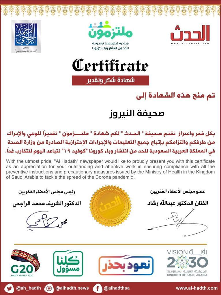 منحت صحيفة الحدث السعودية ، شهادة شكر وتقدير ، لوكالة نيروز الإخبارية ، تحت عنوان ملتزمون ، وذلك تقديراً للوعي والإدراك ، للالتزام من قبل  نيروز ،بإتباع جميع التعليمات والإجراءات الاحترازية الصادرة من وزارة الصحة ،في المملكة العربية السعودية ؛ للحد من إنتشار وباء كورونا كوفيد ١٩ .