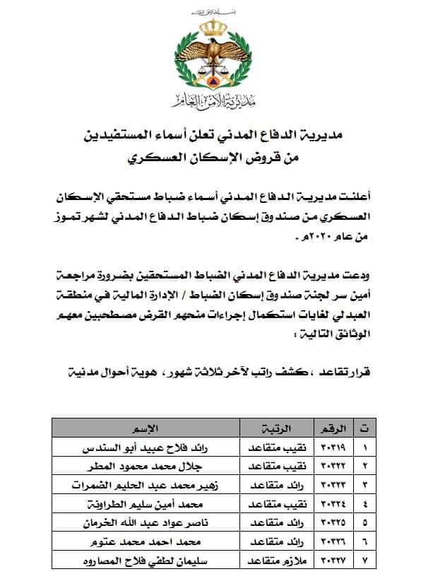 اعلنت مديرية الدفاع المدني اسماء ضباط مستحقي الاسكان العسكري من صندوق اسكان ضباط الدفاع المدني لشهر تموز من عام ٢٠٢٠ م .