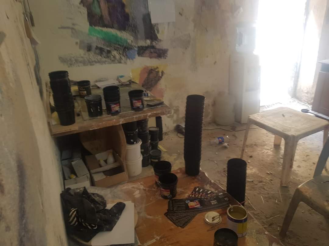 ضبطت دائرة الشؤون الصحية في بلدية الزرقاء بالتعاون مع شرطة البيئة وكادر المنطقه السادسة بضبط احد الأشخاص يقوم بتصنيع الدهان داخل احد المنازل السكنية والتي يمنع استخدامها كمشغل او مصنع لمثل هذه المهن.