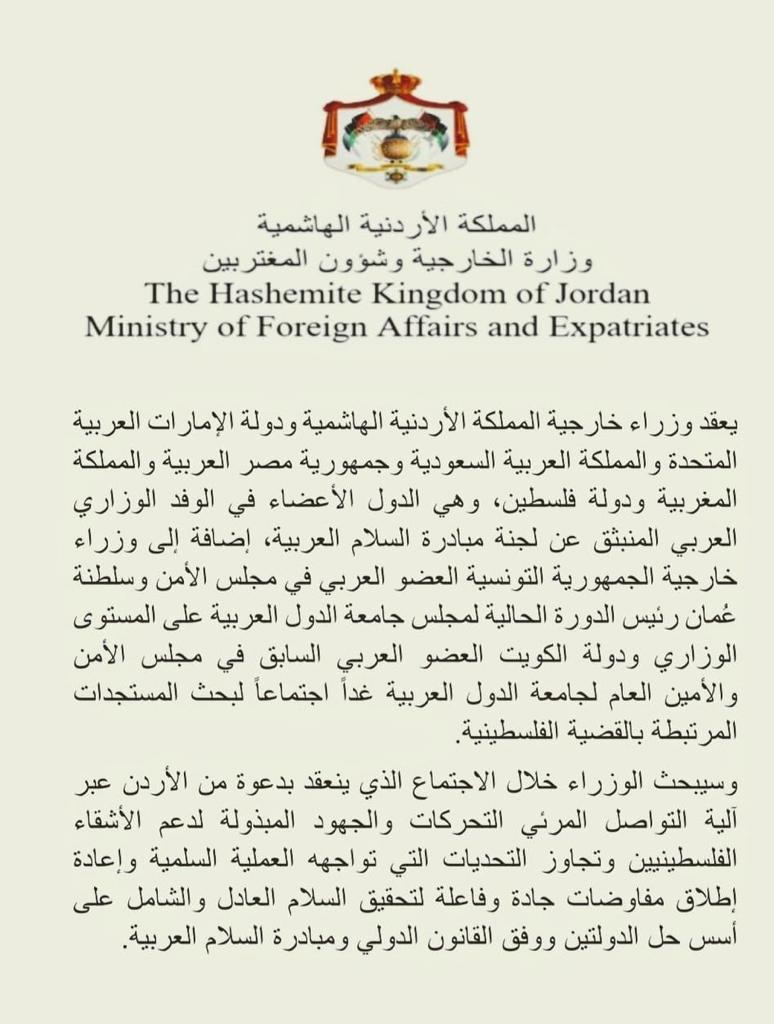 يعقد وزراء خارجية المملكة الأردنية الهاشمية ودولة الإمارات العربية المتحدة والمملكة العربية السعودية وجمهورية مصر العربية والمملكة المغربية ودولة فلسطين، وهي الدول الأعضاء في الوفد الوزاري العربي المنبثق عن لجنة مبادرة السلام العربية، إضافة إلى وزراء خارجية الجمهورية التونسية العضو العربي في مجلس الأمن وسلطنة عُمان رئيس الدورة الحالية لمجلس جامعة الدول العربية على المستوى الوزاري ودولة الكويت العضو العربي السابق في مجلس الأمن والأمين العام لجامعة الدول العربية غداً اجتماعاً لبحث المستجدات المرتبطة بالقضية الفلسطينية.