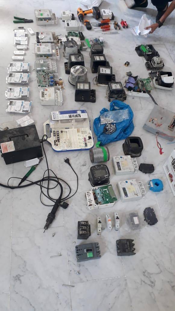 ضُبط بحوزتهما كمية من عدادات الكهرباء ومجموعة من الاختام المزورة وختامة ومجموعة من الاسلاك وباج مزور .